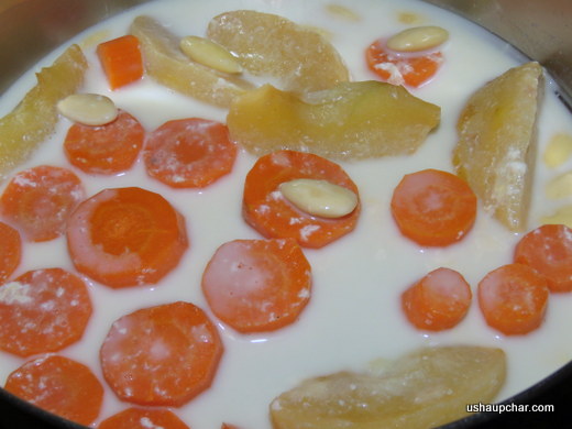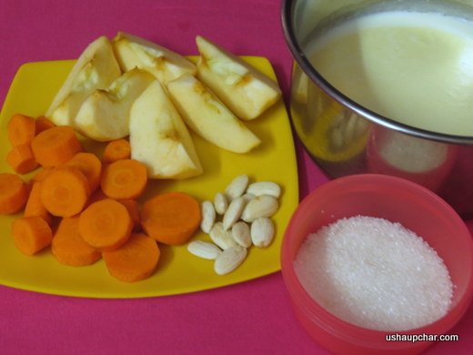 Add carrot, apple almond in a container add 1/2 cup of milk, place it in a pressure cooker pan (add water to the base) cook it for 1 whistle. when it is done, allow it to cool, blend it to a smooth paste
