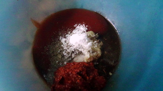 Add red chilly paste,tomato sauce,soy sauce,ginger garlic paste,vinegar,chilly powder, pepper powder,salt in a bowl and mix altogether properly.
