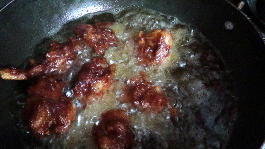 Heat oil in a kadai,when oil is hot deep fry marinated chicken pieces