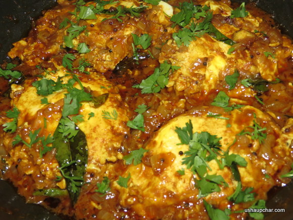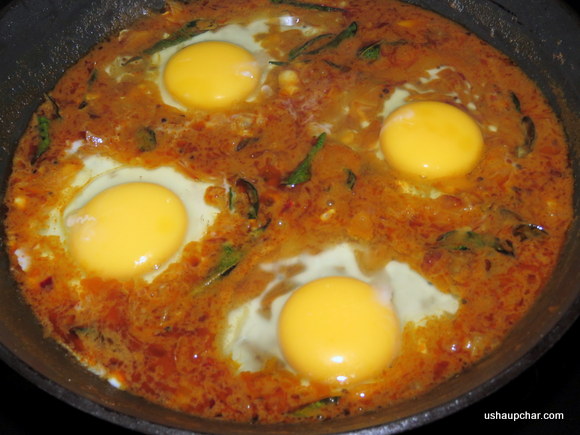 Ensure the mixture reached to a gravy consistency, make a low flame break egg add it on the curry so that it doesn’t touch/mix with each other, as shown in the image. cook covered on a low flame for 10 min without disturbing until done.