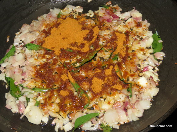 Keep all the above ingredients handy. Heat a heavy bottomed pan/shallow pan. Add oil to it when it is hot sizzle mustard, now add onion and curry leaves, fry until it turns light brown, once it is done add sambar powder and turmeric, saute for few secs.