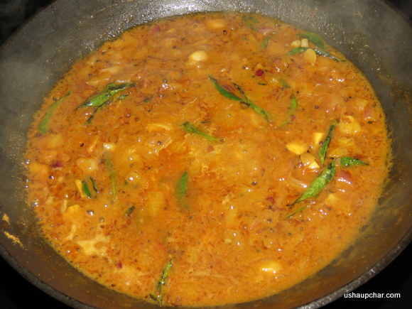 Boil the curry to a gravy consistency, check the taste if it needs to boil add little more water and again bring it to a thick in consistency to remove the raw aroma, give a good boil to the mixture.