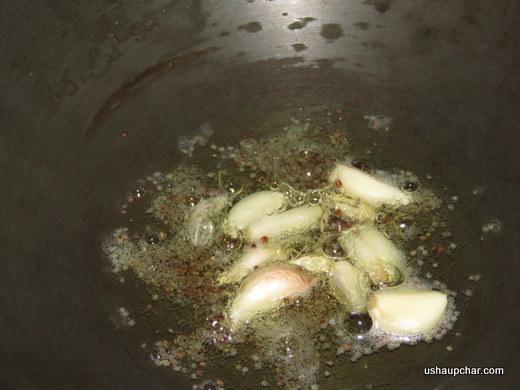 Heat oil in a pan, when it is hot add mustard seeds, allow it to splutter in oil, add garlic pods and saute in oil for a minute until you get a nice aroma