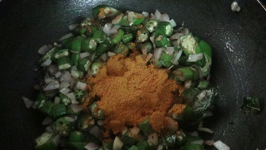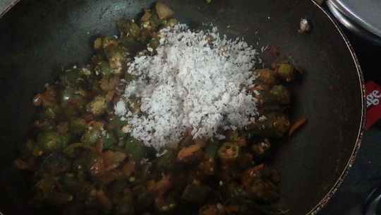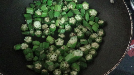 Wash and pat dry okra/lady’s finger,cut into medium pieces,heat a kadai add chopped lady’s finger,dry fry for a while then add 1 tsp of oil and fry it becomes soft.Remove and set aside