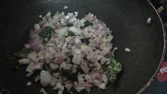 In the same kadai add oil,when it becomes hot add mustard seeds,when it starts to crackle add curry leaves,chopped onions and fry till it turns to translucent.