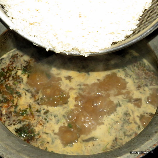 Add mutton stock and water 4 cups ( total 6 cups of water to cook 3 cups of Jeera rice) bring it to boil, squeeze the lemon juice into the boiling mixture. stir