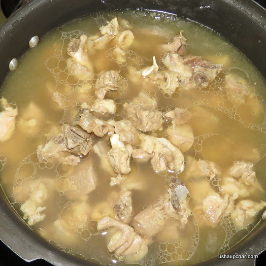 Rinse and clean mutton, drain the water in a colander, and keep ready. Add it to a pressure cooker pan, add salt to taste about 1 tbs, cook until the water in the mutton evaporated completely, it takes 5 to 10 mins, now add 2 measure of water (2 cups of water ) cover the lid of the pressure cooker and cook for 5 whistles.