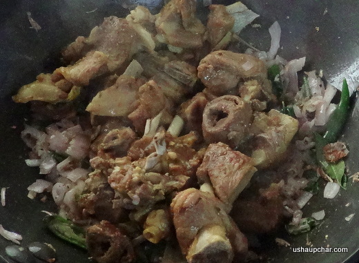 Rinse lamb mutton in water, drain the water in it. Add drained mutton pieces in a pressure pan cook until the water in it absorbs completely, add 1/2 cup of water and salt, pressure cook it for 4 to 5 whistles and keep ready.