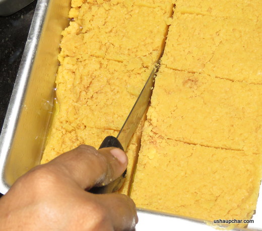 After 3 to 4 min give desired cut when the mixture is hot enough. Separate the squares when completely cooled and store in an airtight container to retain its freshness and crispness.