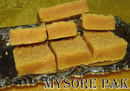 Mysore pak is an authentic sweet dish prepared in Ghee, from South India, usually served as dessert. It originated in Mysore. It is made of generous amounts of Gram flour, sugar and Ghee. Mysore pak was first prepared in the kitchens of the Mysore palace. Paaka shastra (short paka) in Kannada means cooking procedure or cooking techniques. Also paka in Kannada refers to sticky sugary syrup obtained by simmering sugar with equal amount of water. It is traditionally served in weddings and other festivals of southern India and is very popular in baby showers as well.