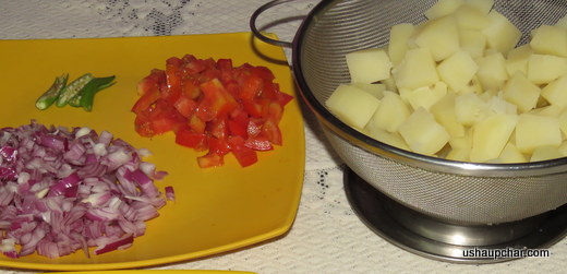 Peel potatoes, cut it into medium size cubes, rinse it in water, drain, put it in a pressure cooker, add 2 cup of water and cook it for 2 to 3 whistles, once done drain the water in it and keep ready.