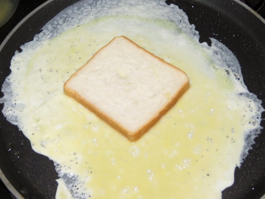 Immediately place a slice of bread on it, apply oil/ butter around it. Cook for 30 sec