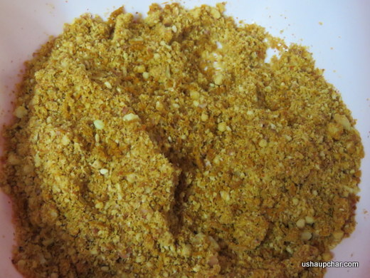 - Add roasted peanuts, sesame seeds in a mixer jar, blend it to a coarse powder, add it to a clean bowl