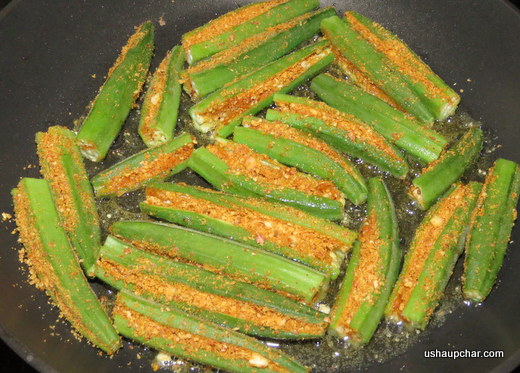When the oil is hot, gently arrange stuffed veggies, cook in a medium flame, close the lid for 2 min, stir gently once or twice before it is done, it take 5 to 6 min to be done. (take care not to over roast /burn as it spoils the taste of the dish)