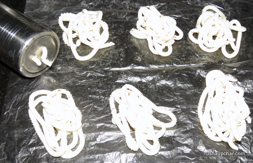 Fill the prepared dough inside the chakli mould, press it/screw it to spirals evenly on a butter paper/greased plastic sheet