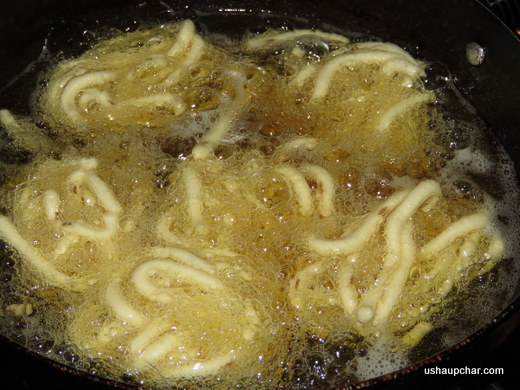 Deep fry them until it turns to light brown and crisp, in a medium flame, Once done, flip it to the other side gently on by one, deep fry until crisp in a medium flame.