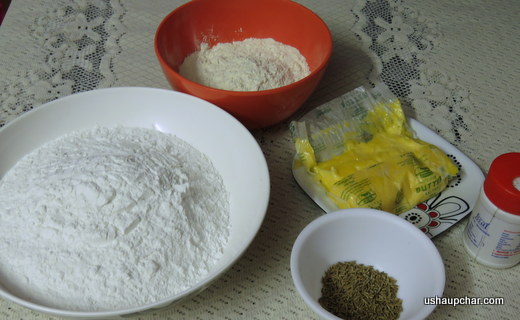 Add rice flour, urad dal flour, cumin, butter, hing, salt in a bowl, mix together properly without adding water.